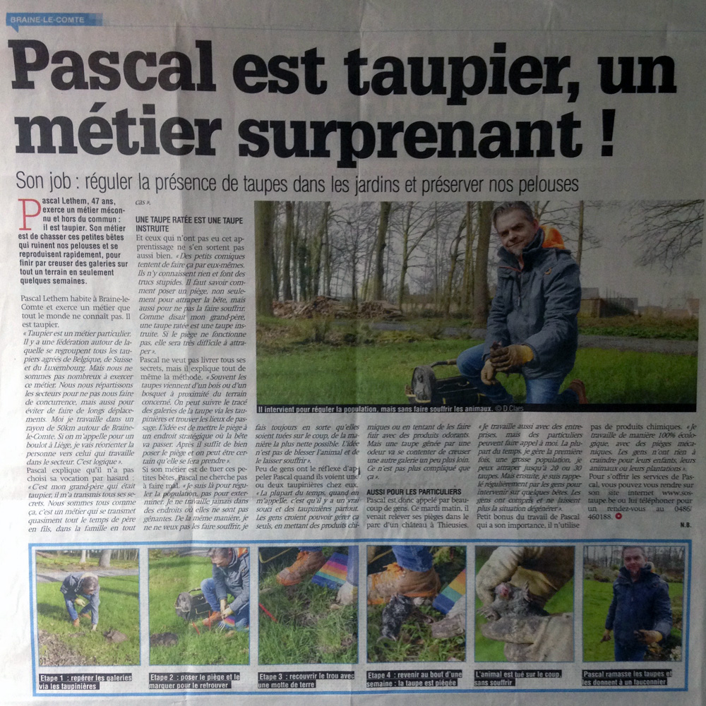 Magnifique article de Nord Eclair à découvir sur Pascal Lethem, l’un de nos taupiers à votre service dans le Hainaut, qui vous en apprendra un peu plus sur notre métier.